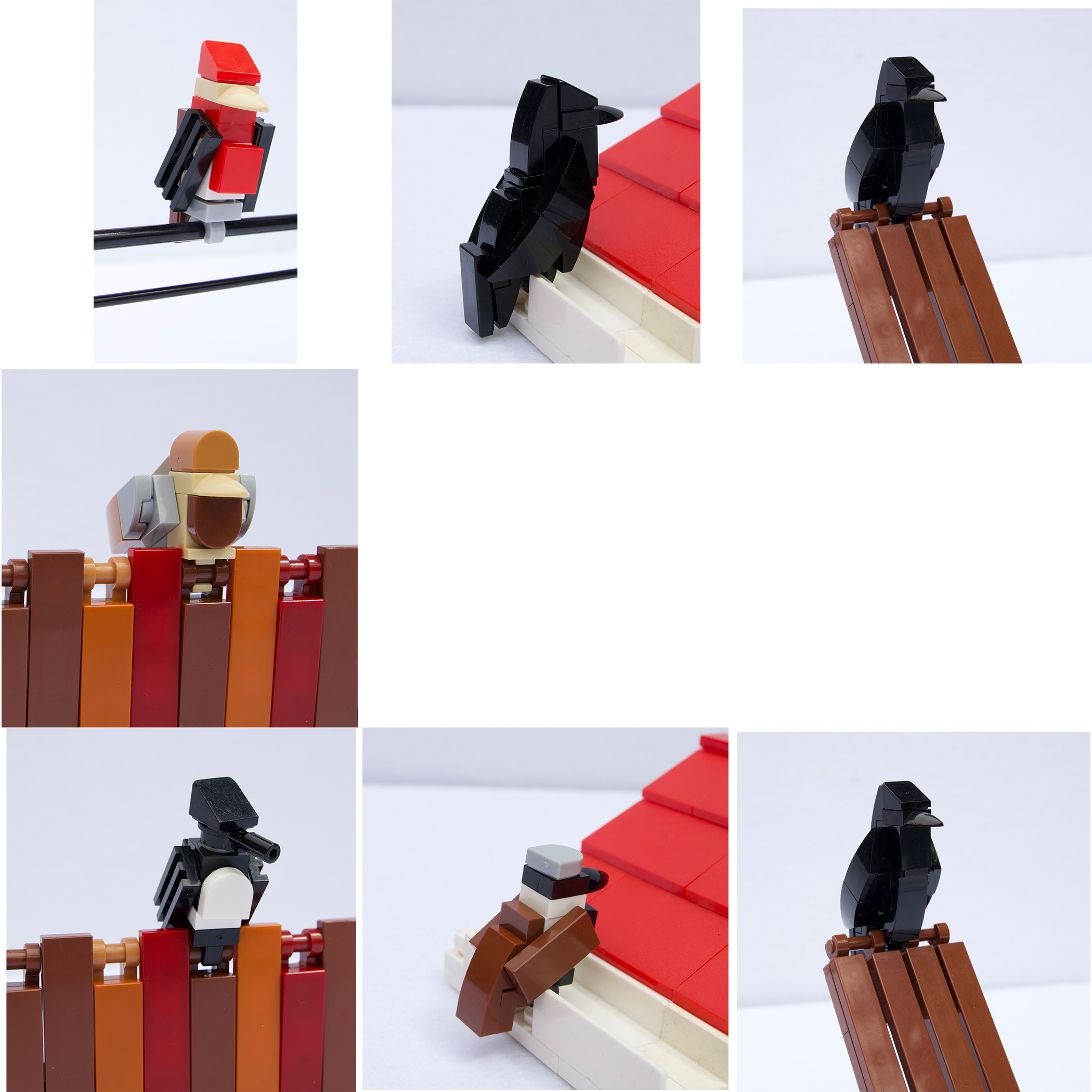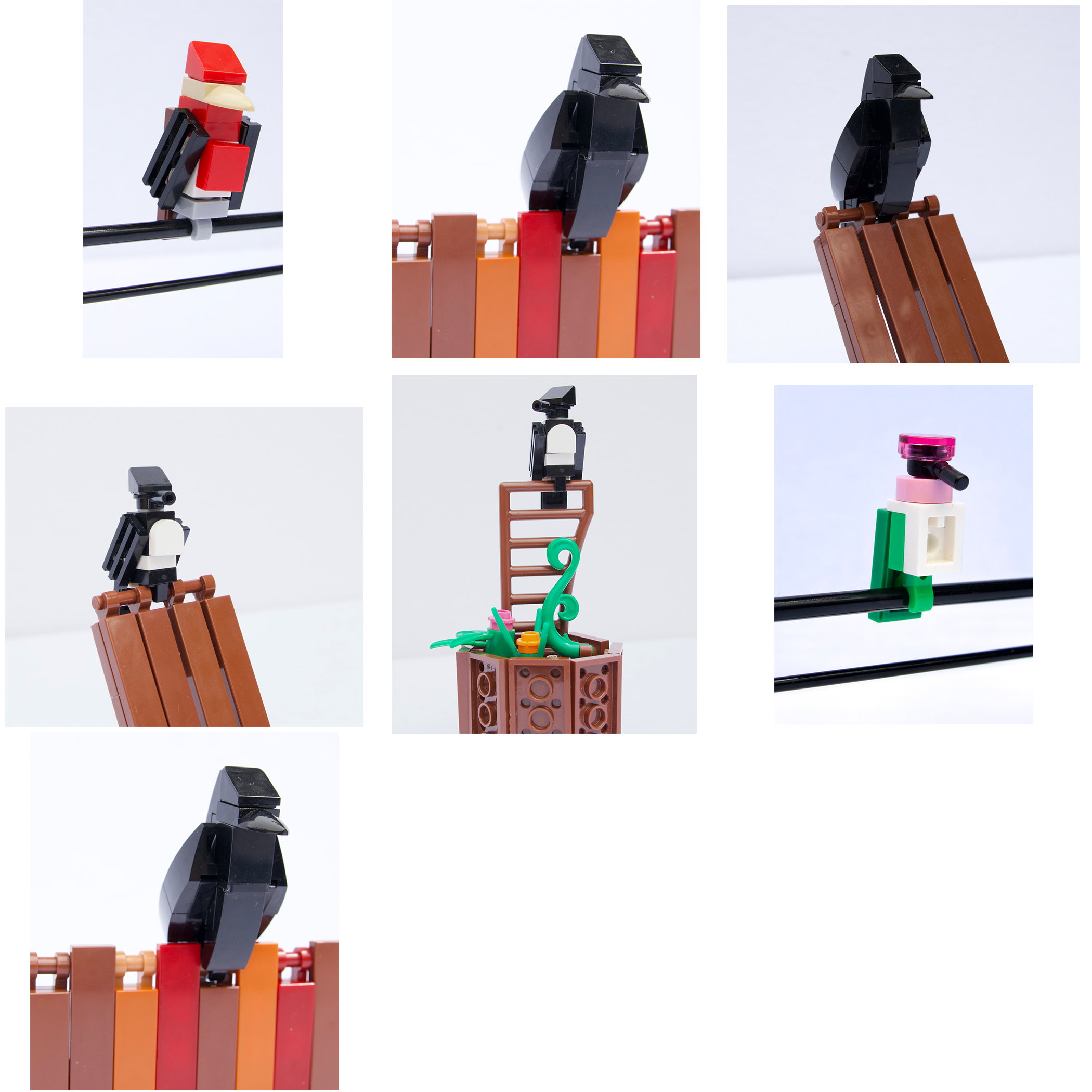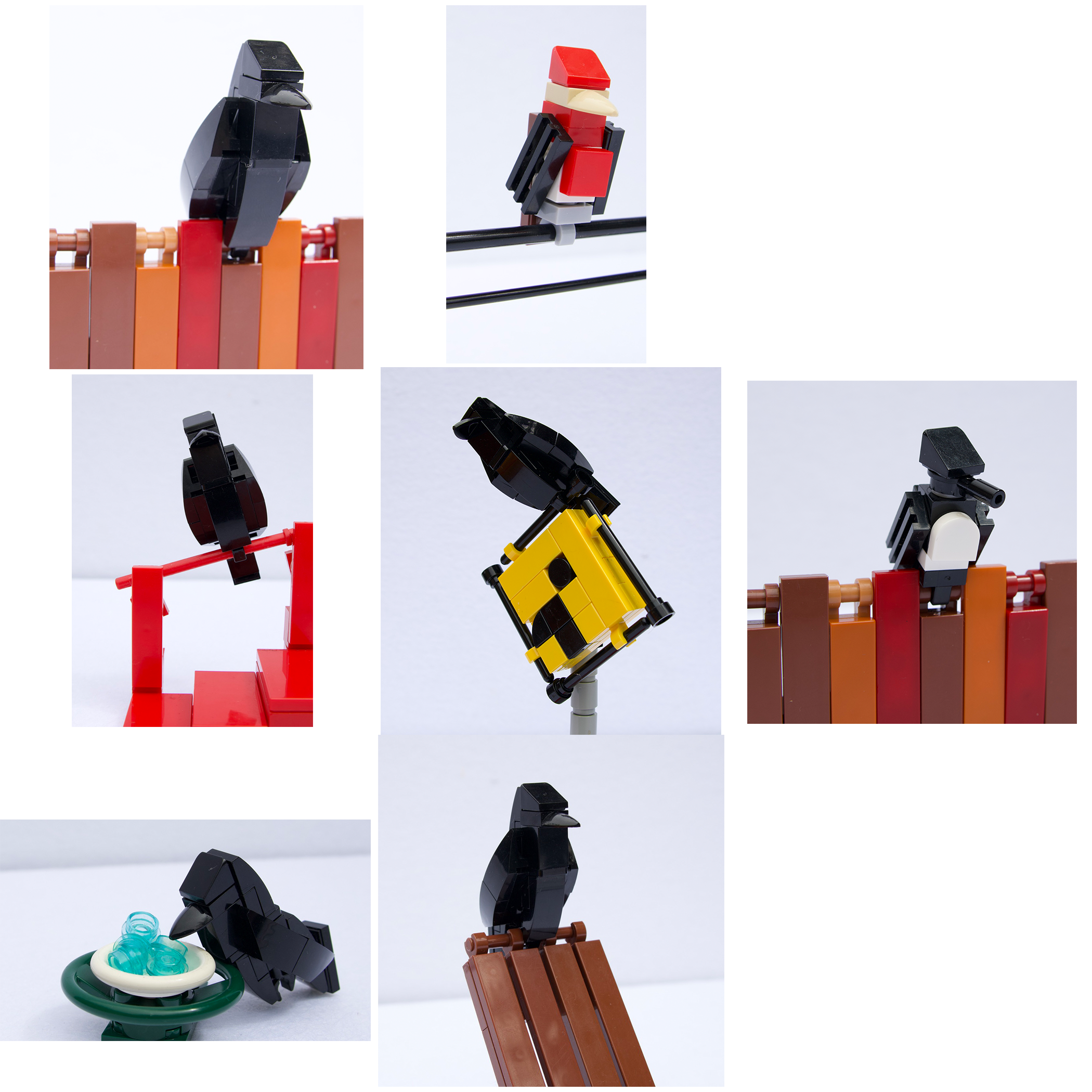 house finch, wire; american crow, fence; american crow, chair; black phoebe, chair; black phoebe, garden bed; anna's hummingbird, wire; american crow, fence