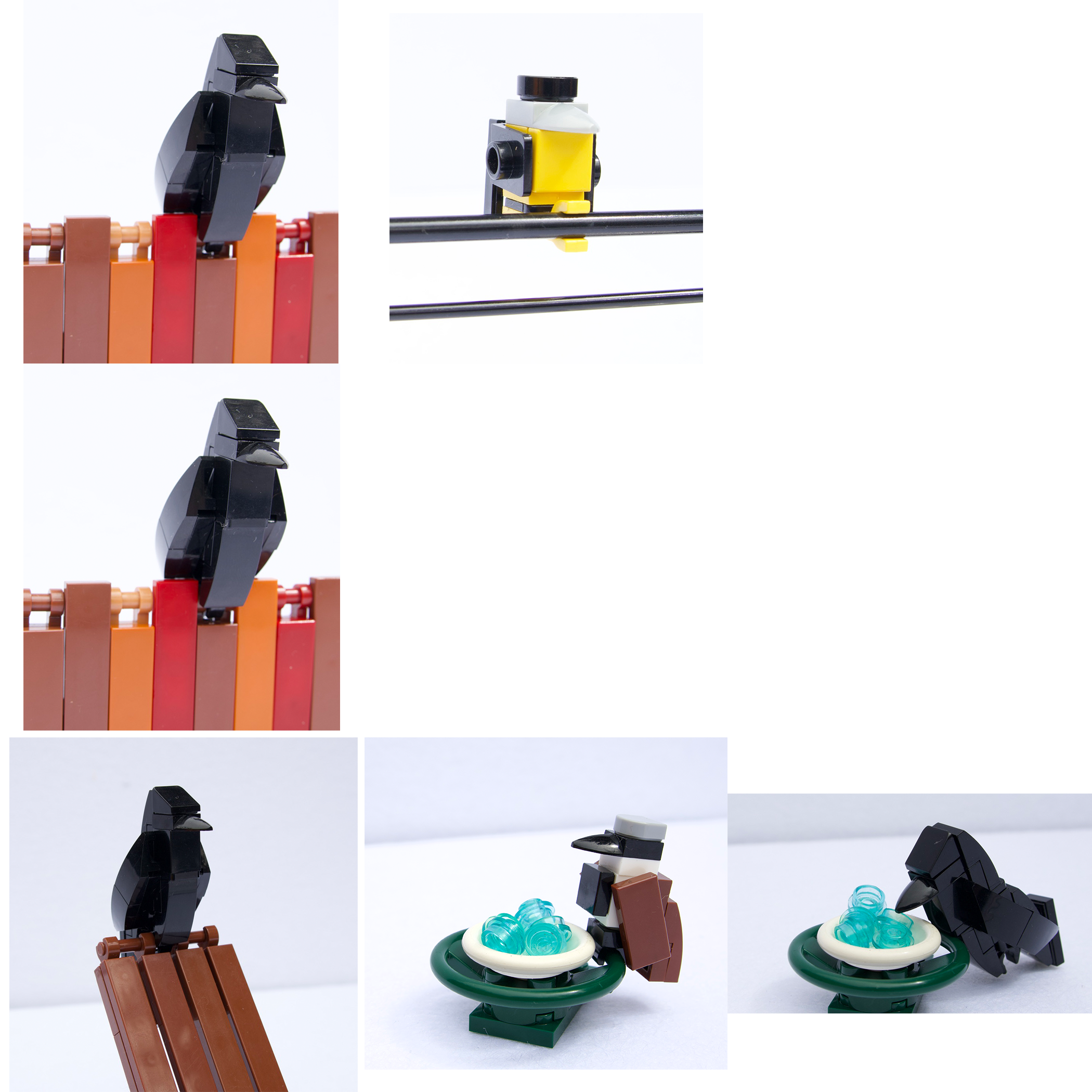 american crow, fence; lesser goldfinch, wire; american crow, fence; american crow, chair; house sparrow, water dish; american crow, water dish