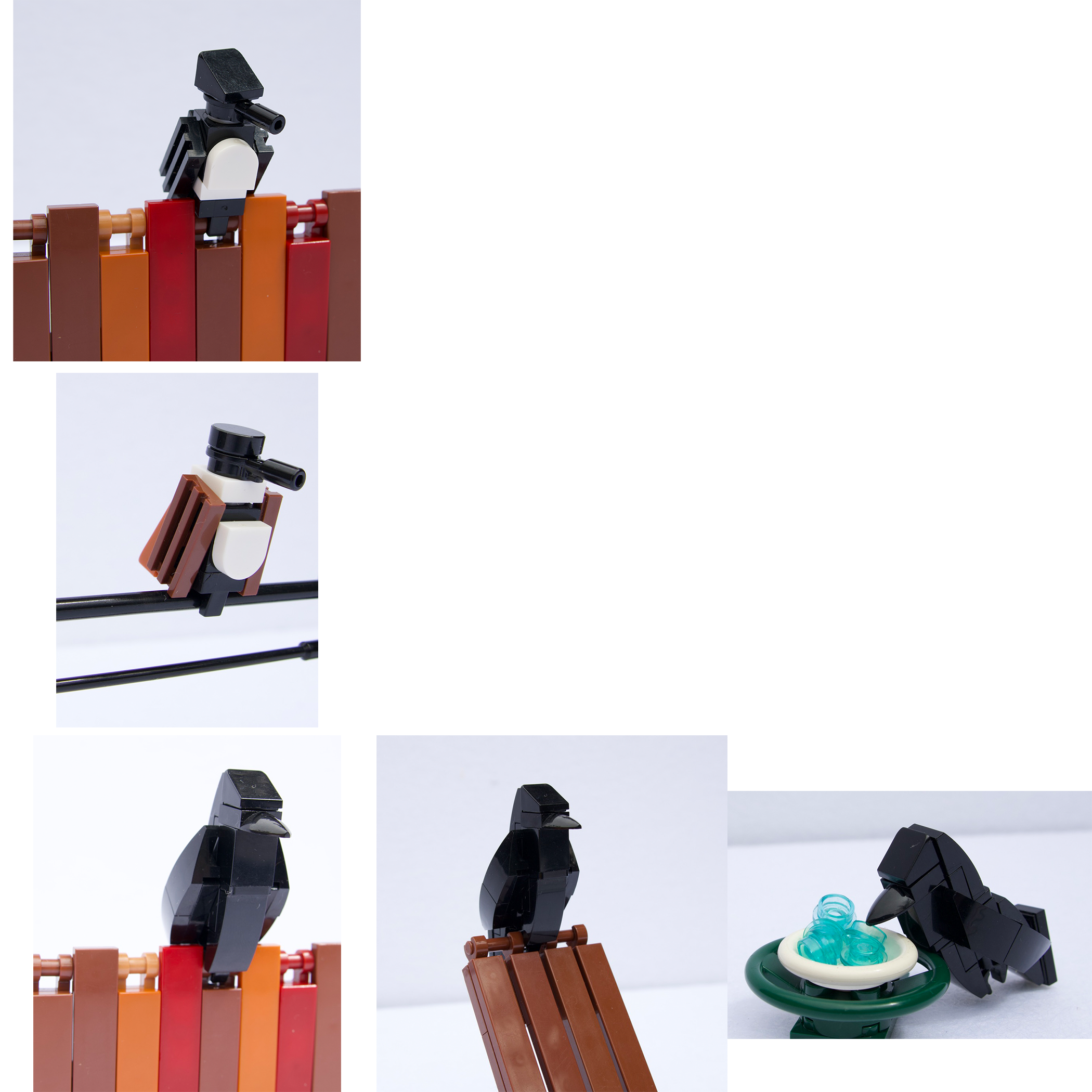 black phoebe, fence; chestnut-backed chickadee, wire; american crow, fence; american crow, chair; american crow, water dish